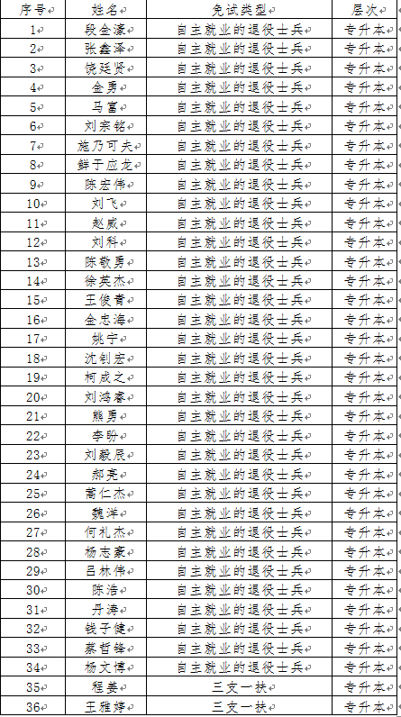 根据教育部和湖北省关于高校成人教育招生考试免试条件的有关文件规定和要求,退役军人免试条件是专科毕业且自主就业或者自主择业的考生,“三支一扶”条件是普通专科毕业且有“三支一扶”证明的考生。今年报考我校的免试生有两种类型:退役军人和三支一扶考生。经我校对考生材料初步审核,36名考生符合免试条件。现公示如下: